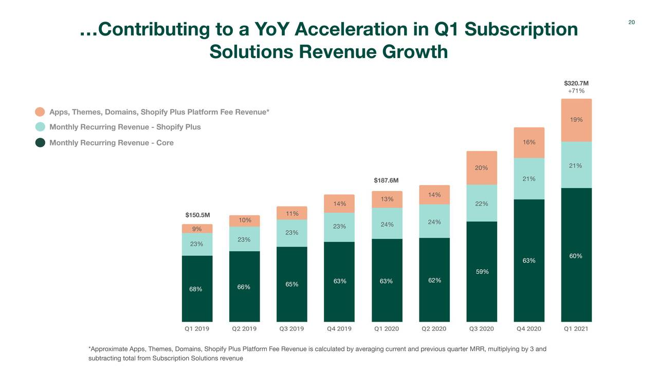 Looking at Shopify's revenue, the revenue generated via apps, themes, and Shopify Plus Platform fee witnessed an increase from 9% in Q1 2019 to 19% in Q1 2021. The revenue contributed by apps may decrease slightly given the cut and reduction of the commission. However, we think the number gonna get much higher in the long run with the launch of the new Shopify theme marketplace and more apps starting to charge customers through the Shopify Billing API.
